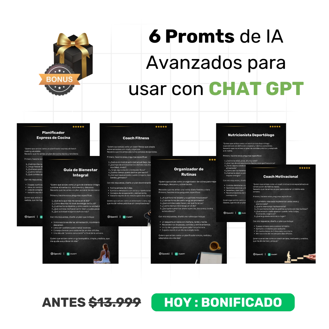 No. Te guío paso a paso para que copies y pegues los prompts en ChatGPT y obtengas rutinas, menús o planes personalizados en segundos, sin ser experta en tecnología.